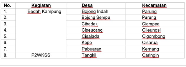 Melalui RP3KP, diharapkan Kabupaten Bogor dapat melaksanakan penanganan kawasan kumuh atau Kegiatan Peningkatan Kualitas Kawasan Permukiman Kumuh dengan Luas di Bawah 10 (sepuluh) Ha, Sub Kegiatan Pelaksanaan Peremajaan Kawasan Permukiman Kumuh (Sub Sub Kegiatan Bedah Kampung dan P2WKSS), dengan rincian lokasi sasaran kegiatan sebagai berikut :